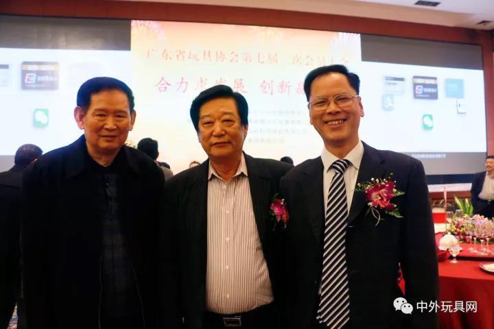 ▲合力求發展,創新贏未來。2016年廣東省玩具協會會員大會上,廣東省玩具協會會長李卓明(右)與澄海玩具協會會長郭卓才(中)談笑風生并合影