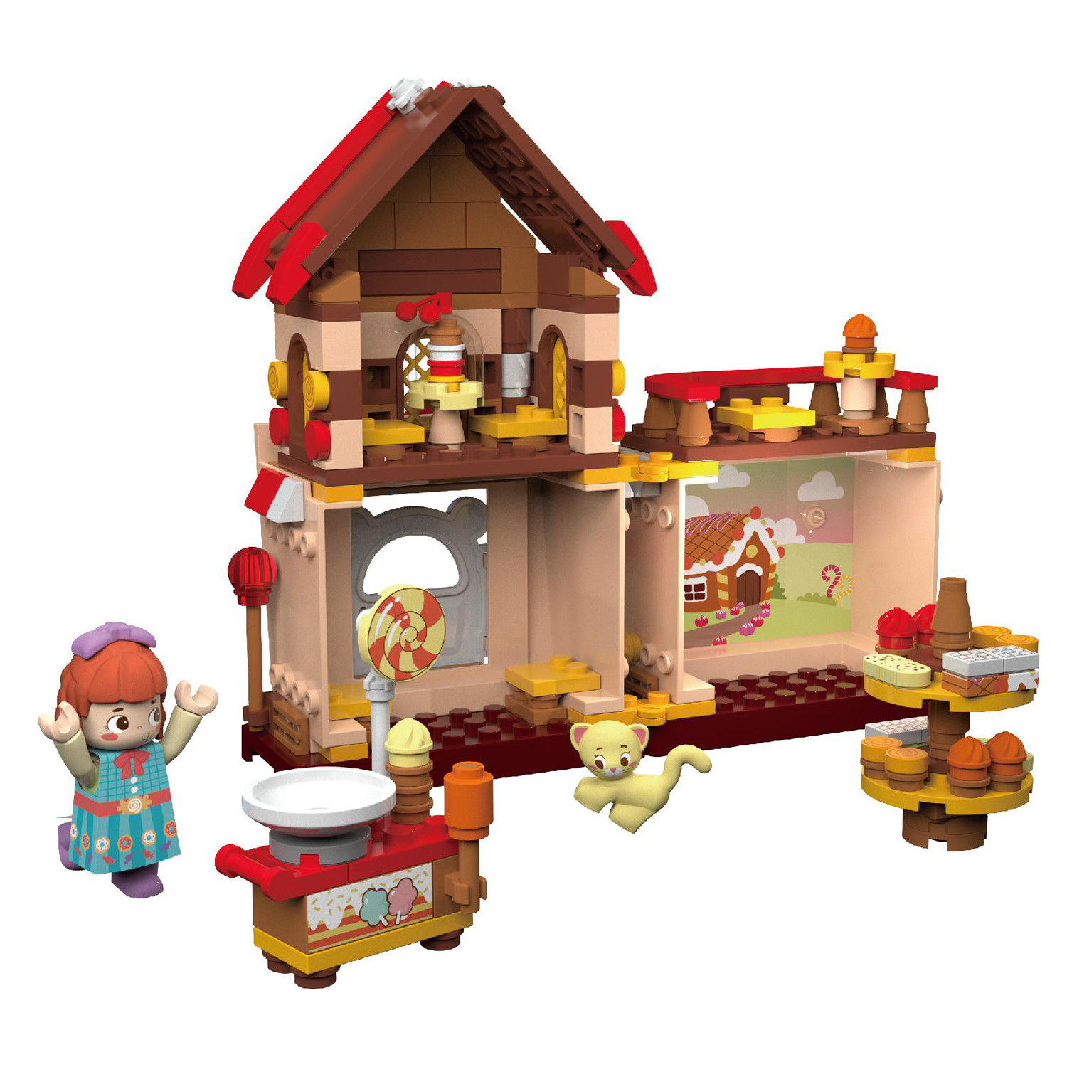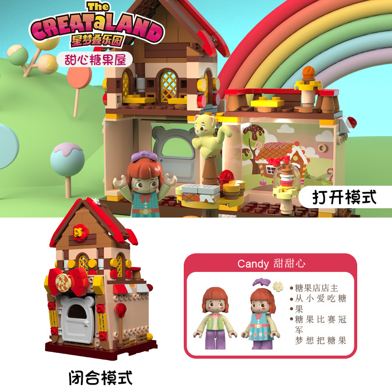 每一位小朋友都喜歡吃糖果,那么糖果到底是怎么來的呢?讓小朋友帶著這個問題,動手搭建一個快樂的糖果屋吧,游戲的過程中能讓小朋友找到答案。這是一個五彩繽紛的雙層小屋,屋頂是巧克力顏色,看著都很有食欲。一樓是糖果銷售中心,真正的秘密就藏在二樓里面,隨著糖果機的轉動,一顆顆甜美的糖果被生產出來,它們被放在展示架子上,放在了銷售展車上,最終,這些糖果會被送到每一個小朋友的手上。